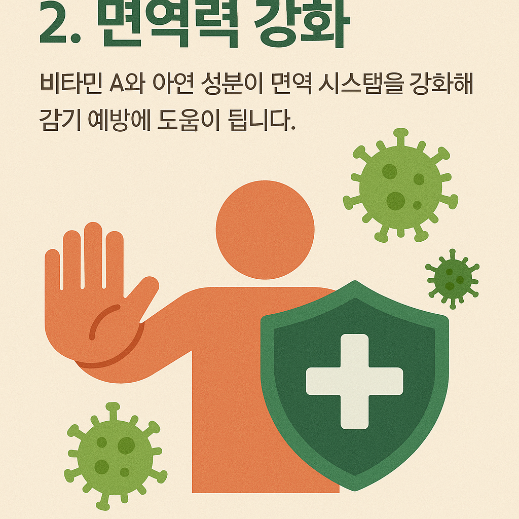 비타민 A와 아연 성분이 면역 시스템을 강화해 감기 예방에 도움이 됩니다.